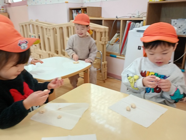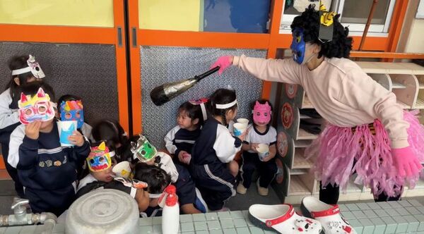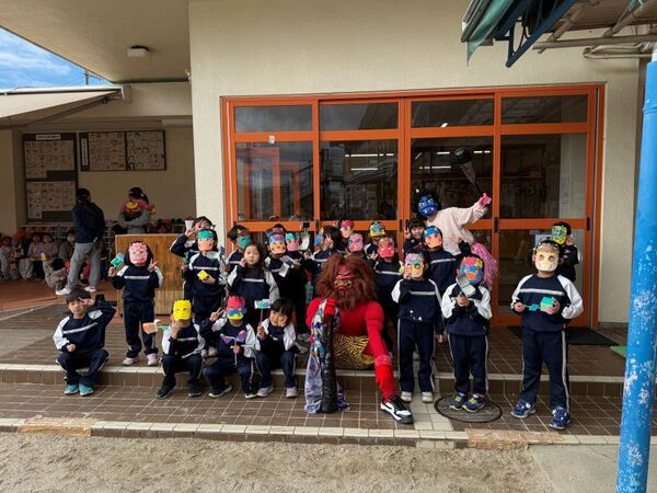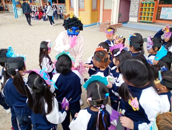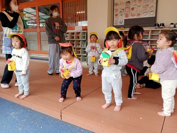 子どもたちは作ったお面を付けたりして「鬼は外!福は内!」と元気いっぱいに豆まきを楽しみました。